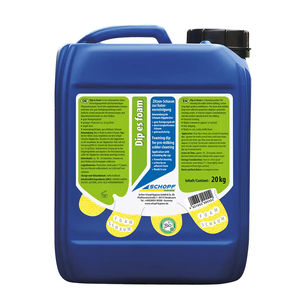 Dip es foam is a foaming udder pre-cleaning agent with high-quality care substances. The long-lasting foam achieves a very good cleaning effect and quickly removes organic soiling and dipping agent residues before milking. Preservation is achieved with organic acids to prevent the transfer of germs.