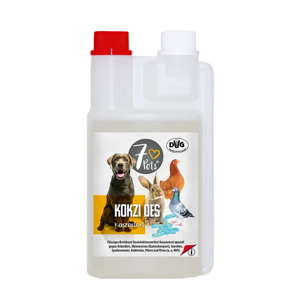 Liquid broad-spectrum disinfectant concentrate specifically against coccidia, myxomatosis (rabbit plague), giardia, roundworm eggs, bacteria, fungi and viruses (including RHD)