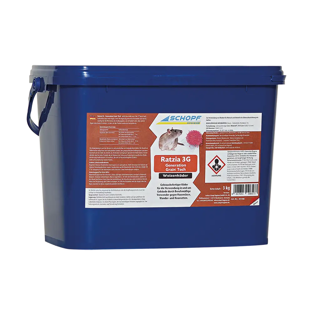 Ratzia® 3G Wheat Bait contains the active ingredient difethialone and is intended for the control of Norway rats, house rats and house mice by professional users. The product is classified as a rodenticide and can cause serious damage to health if swallowed.