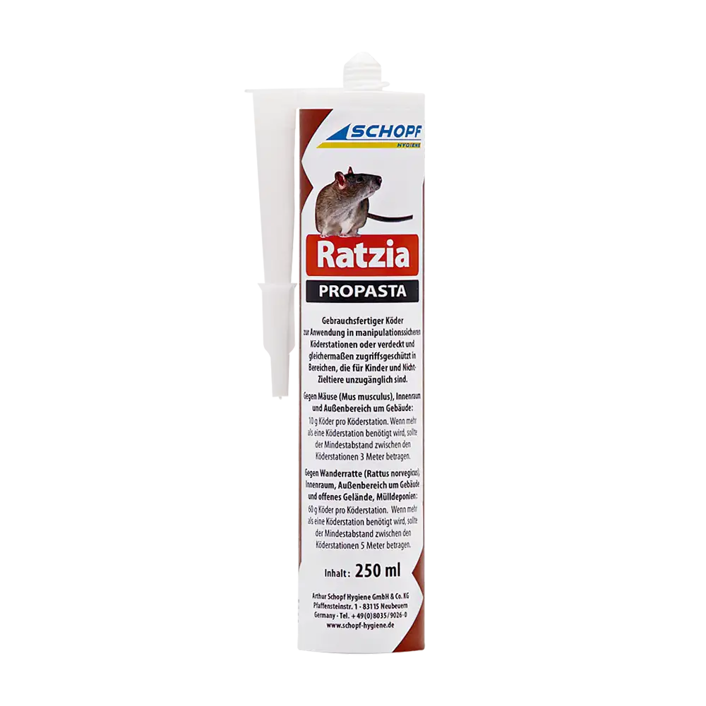 Ratzia® Propasta is a ready-to-use bait for the control of mice and rats. The bait must be used in such a way that children, pets, birds and other non-target animals have no access (tamper-proof bait stations or concealed, inaccessible places).