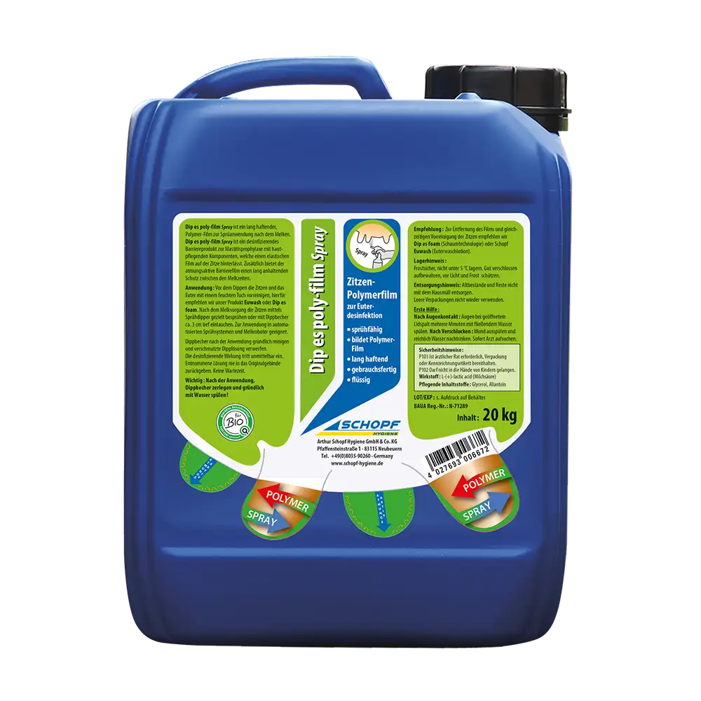 Dip es poly-film Spray ist ein gebrauchsfertiges, sprühfähiges Polymer-Film-Produkt zur Anwendung nach dem Melken. Es bildet einen elastischen, atmungsaktiven Film auf der Zitze, der desinfizierend wirkt und durch hautpflegende Komponenten lang anhaltenden Schutz zwischen den Melkzeiten bietet.