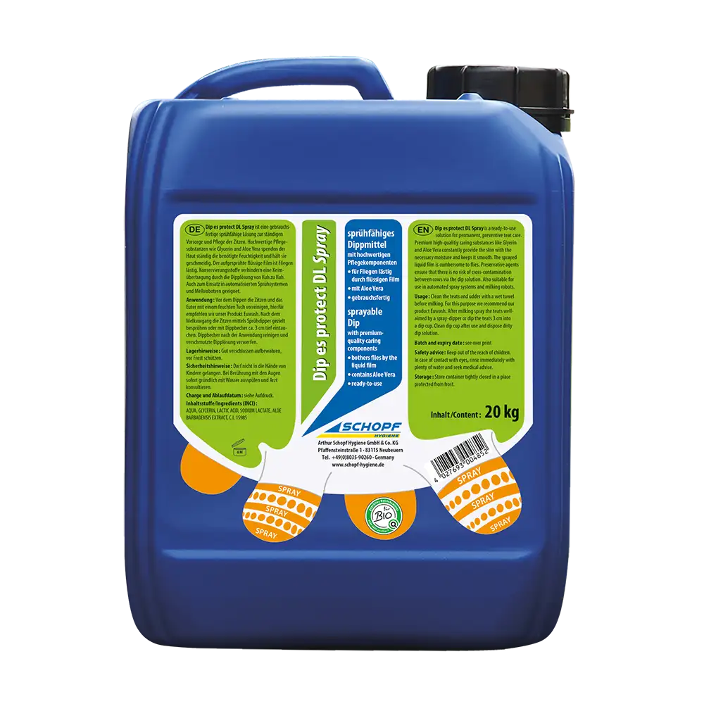Dip es protect DL Spray ist eine milchsäurehaltige, gebrauchsfertige und sprühfähige Dipp-Lösung mit desinfizierenden Eigenschaften zur Mastitisprophylaxe. Die Formel enthält hochwertige pflegende Substanzen wie Aloe Vera, Allantoin und Glyzerin. Das Produkt ist für berufliche Anwender vorgesehen und erlaubt die uneingeschränkte Milchabgabe.