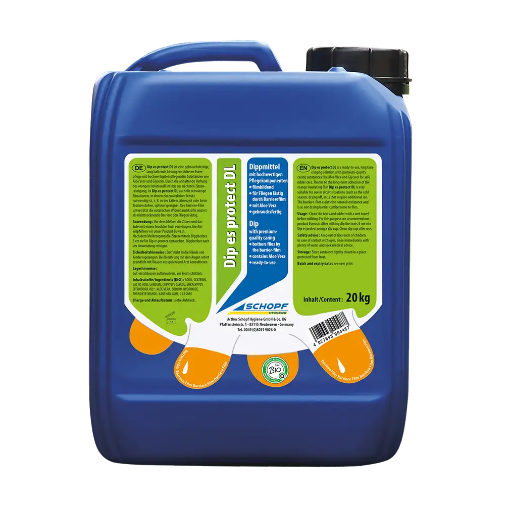 Dip es protect ist eine gebrauchsfertige, lang haftende Lösung zur sicheren Euterpflege. Die Formulierung enthält hochwertige pflegende Substanzen wie Aloe Vera und Glycerin und bildet einen orangen Isolationsfilm, der bis zur nächsten Zitzenreinigung haften bleibt. Der nicht-trocknende Barrierefilm unterstützt die natürlichen Widerstandskräfte und ist für Fliegen lästig.