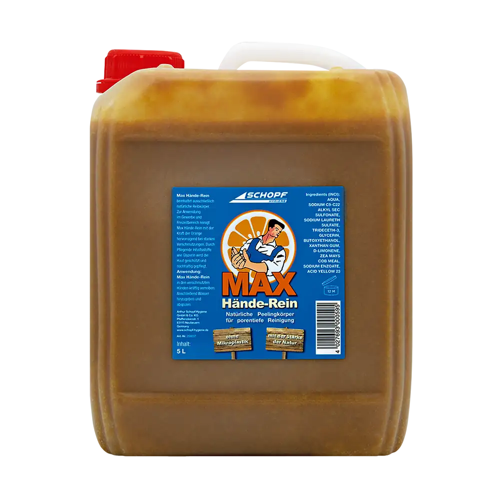 Max Händerein ist ein kraftvoller Handreiniger für den Einsatz im gewerblichen Bereich und in der Freizeit. Er entfernt selbst hartnäckige Verschmutzungen und pflegt die Haut durch enthaltenes Glycerin.